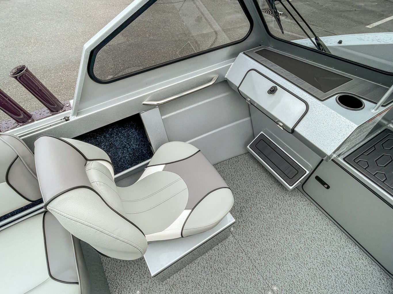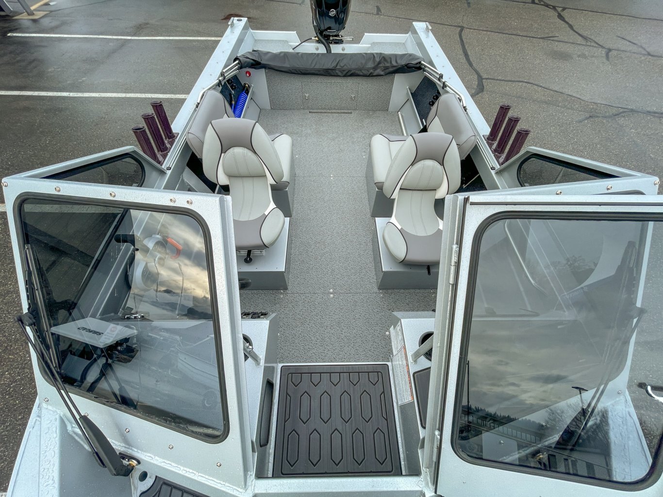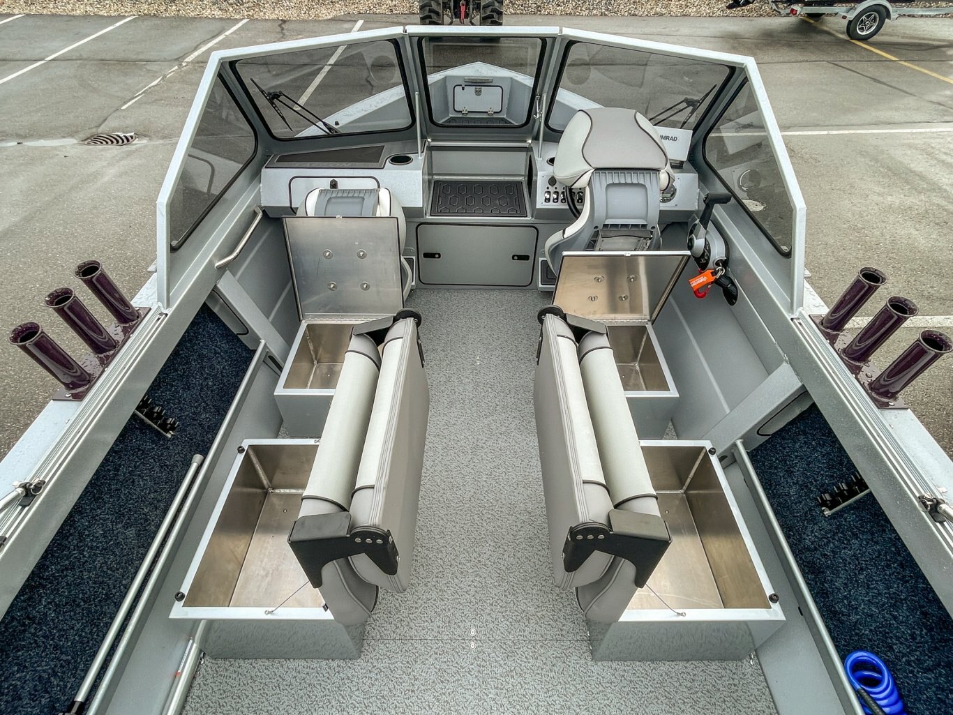 • 2 Fishmaster XL seats with pinchless hinges on diamond plate storage boxes